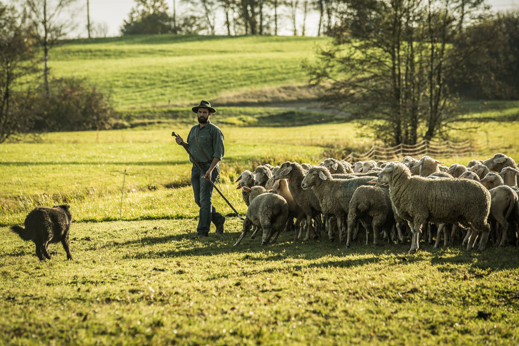 Die Herstellung unseres Mähdusa-Garns steht und fällt mit den bayerischen Merino-Schafen. Insgesamt »produzieren« derzeit ca. 1400 Schafe für uns, die von drei Schäfern versorgt werden. Der Quirin aus dem Chiemgau, ist einer davon. Er hat nicht nur einen Familienbetrieb, wie aus dem Bilderbuch, sondern achtet wie alle unsere Schäfer auf die artgerechte Haltung und Unterbringung der Tiere. Dazu gehört auch ab Anfang Mai der Auslauf. Deswegen zieht der Quirin auch mit seiner Herde von Weide zu Weide. Die Tiere können so an Stellen grasen, die mit Gerät nur schwer oder gar nicht zu erreichen sind.